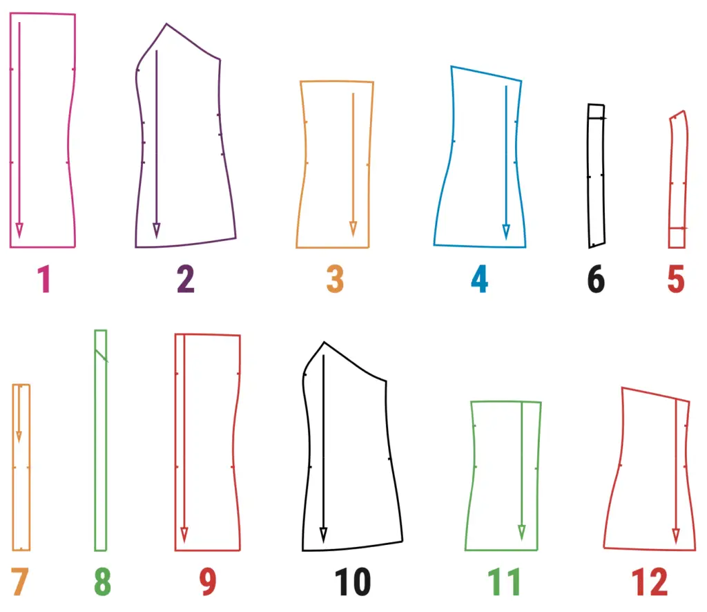 Front facing (5), back facing (6). Reinforce the facing of the front and back with fusible tape along the upper edge. Reinforce the bottom of the lining pieces (9), (10), (11), (12) with fusible tape. Interface the zipper allowances on the central parts of the back (3).