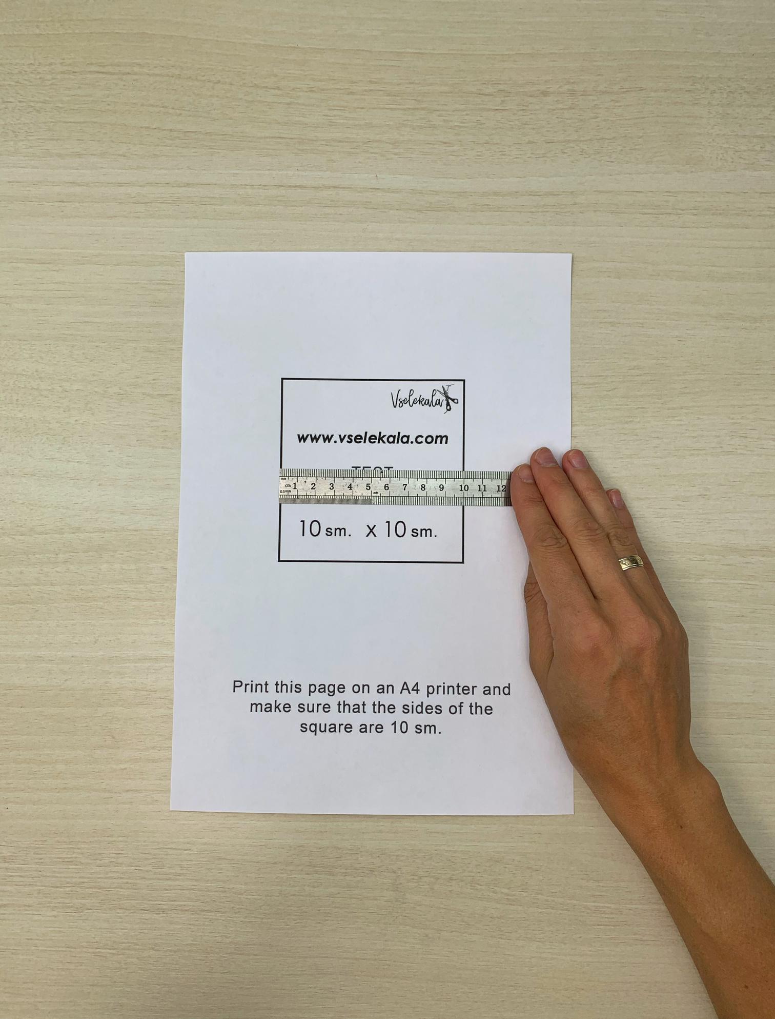 To start, print only 1 page with the test square. To do this, specify the page number 1 when setting up printing. Check whether the first sheet is printed correctly: the test square should be 10/10 cm (3,94/3,94 in). Use a ruler to check that square is at the correct size. If everything is "ok", print the rest of the pages.