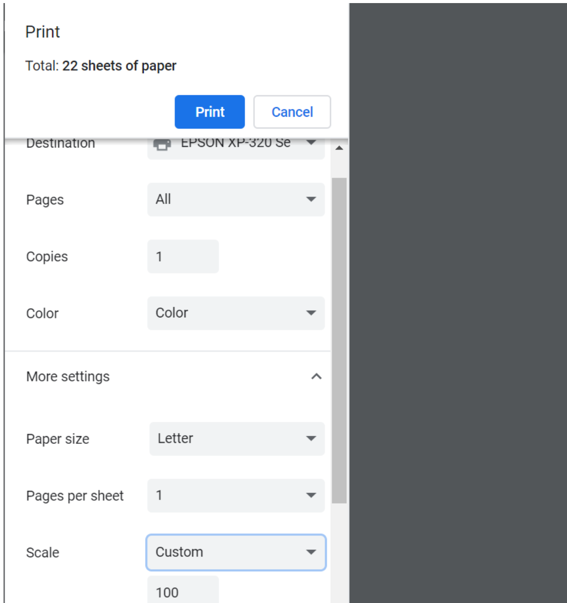 The first part of using any PDF pattern is printing it out. It’s important that when you print out your pattern you do it without scaling. Depending on what program you’re using to print out your pattern things can look a little different. If there’s an option to choose between fit to page and actual size. You have to choose “actual size”. If there’s a scaling percentage option, you have to set it to 100%. In case of the "fit content to the page" tickbox, please untick it.