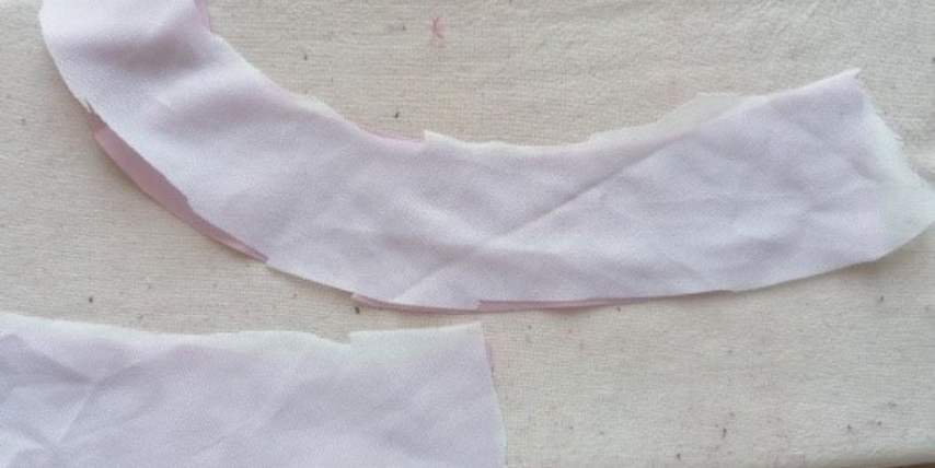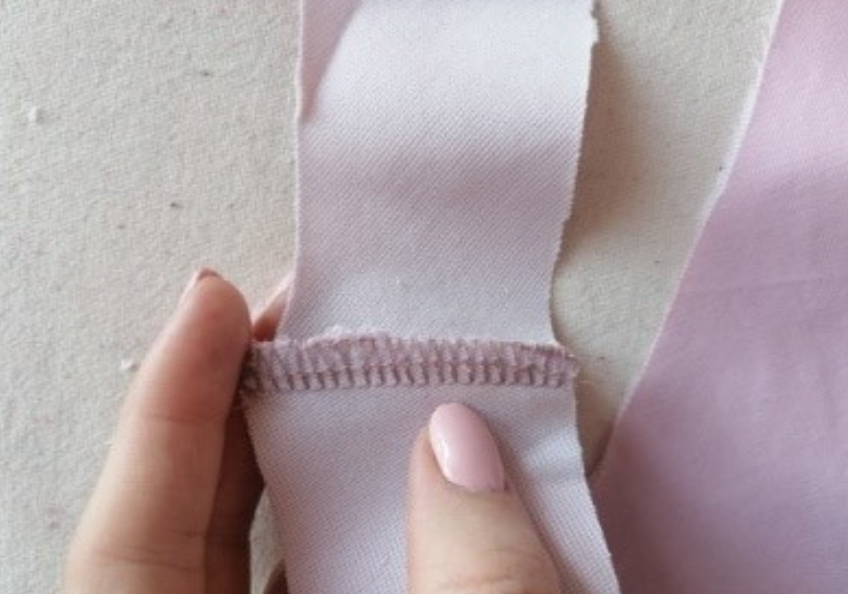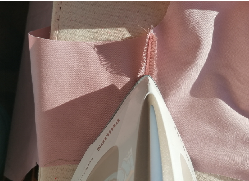 Iron the interfacing to the neckline facing. Leave it for 15 minutes. Pin the short edges together with the right sides and serge. Press It.