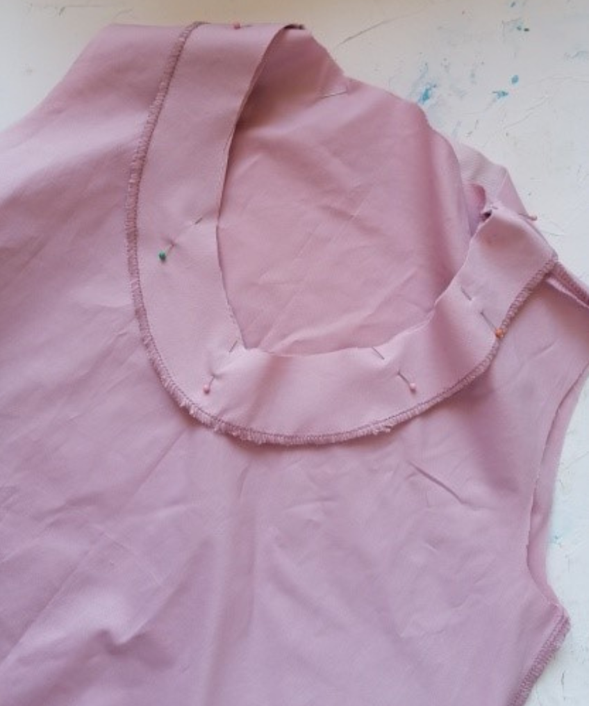 Pin the neckline facing to the neckline with the right sides together. Sew in place. Press the seam allowances to the neckline.