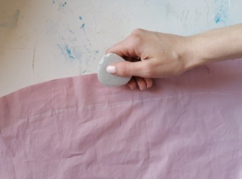 Chalk the stitching line on the bodice. Fold the bottom hem of the bodice to 1 cm (0,39″) and press.