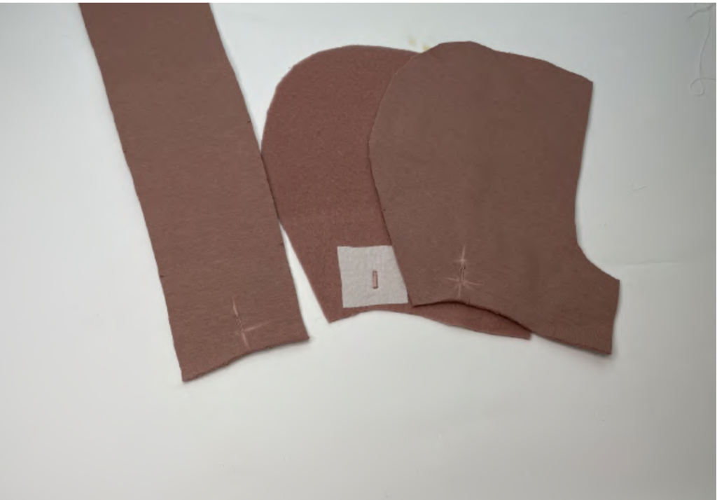 Pin the side hood details to the center hood detail (from the lining fabric) with the right sides together, aligning the notches. Serge it.