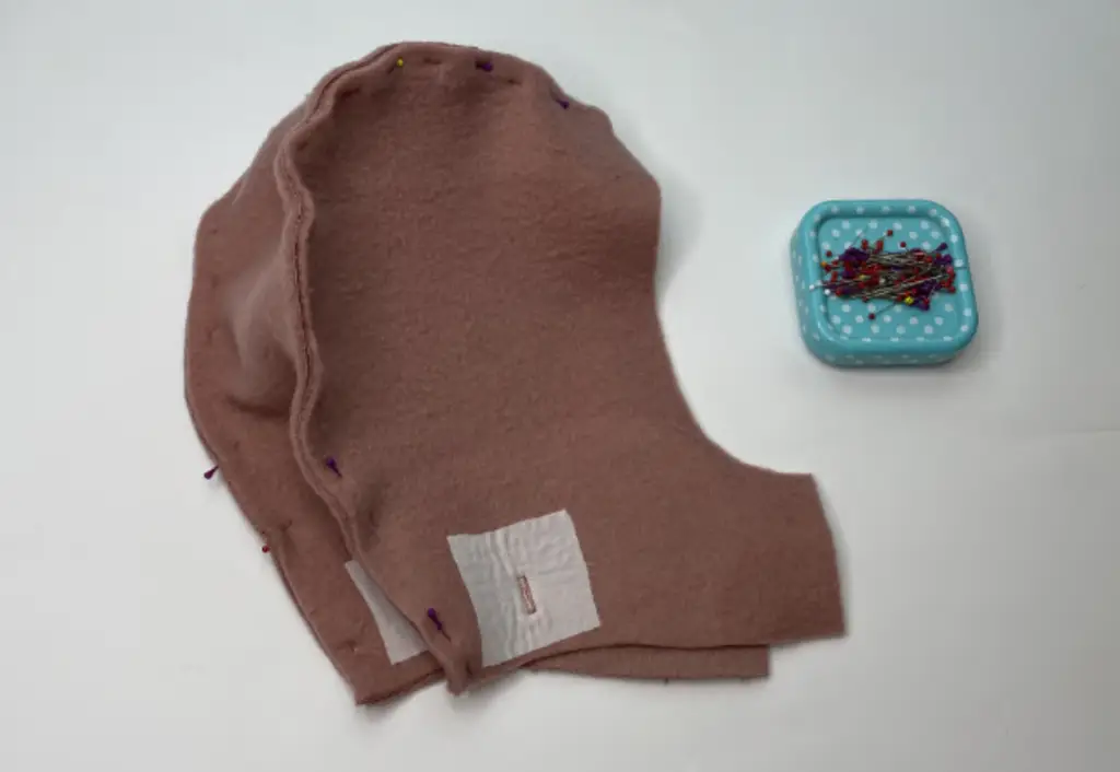 Pin the hood from the main fabric to the lining hood with the right sides together along the rounded edge. Serge it. Press it.