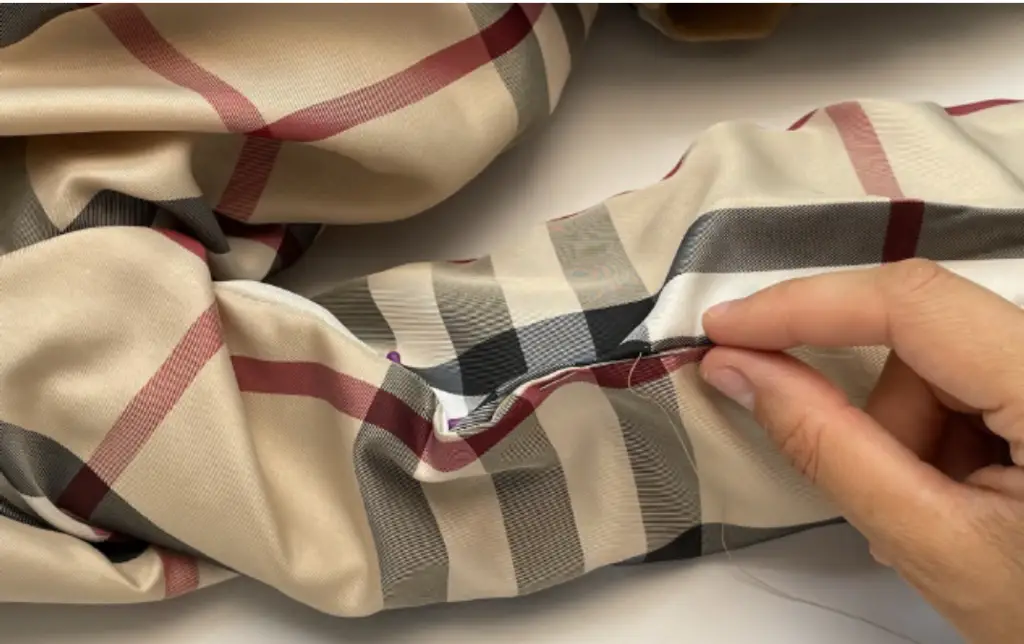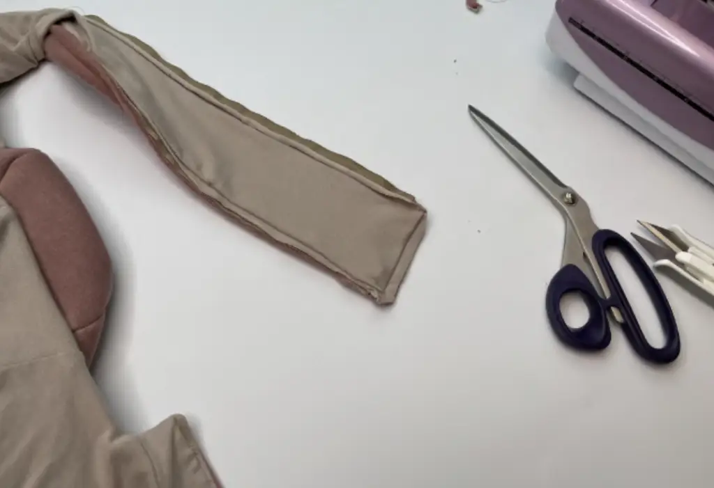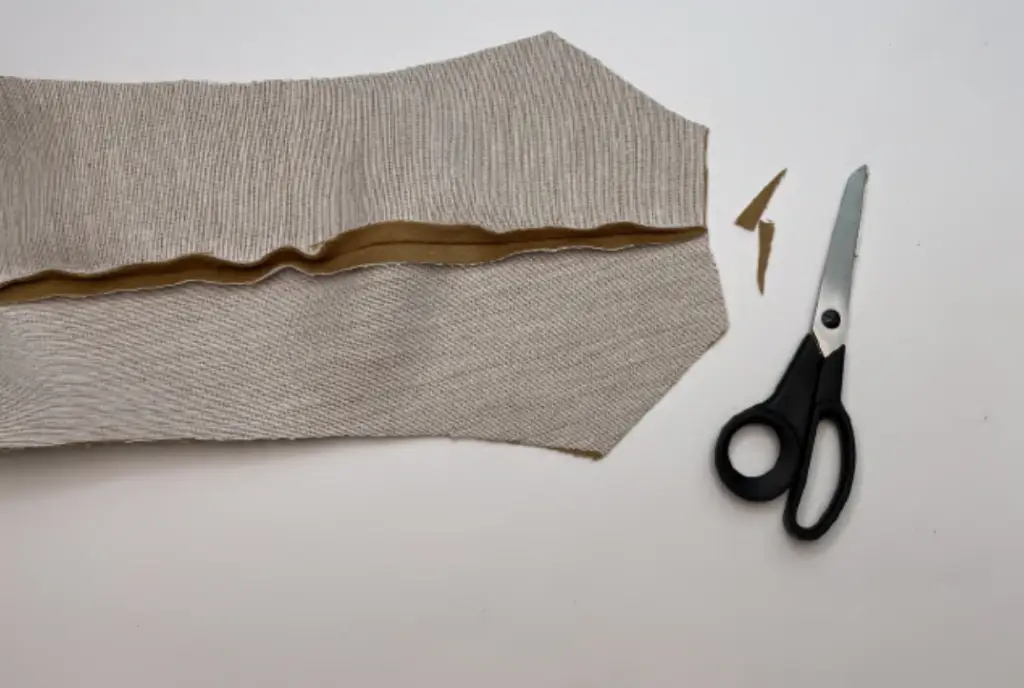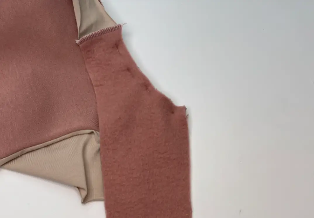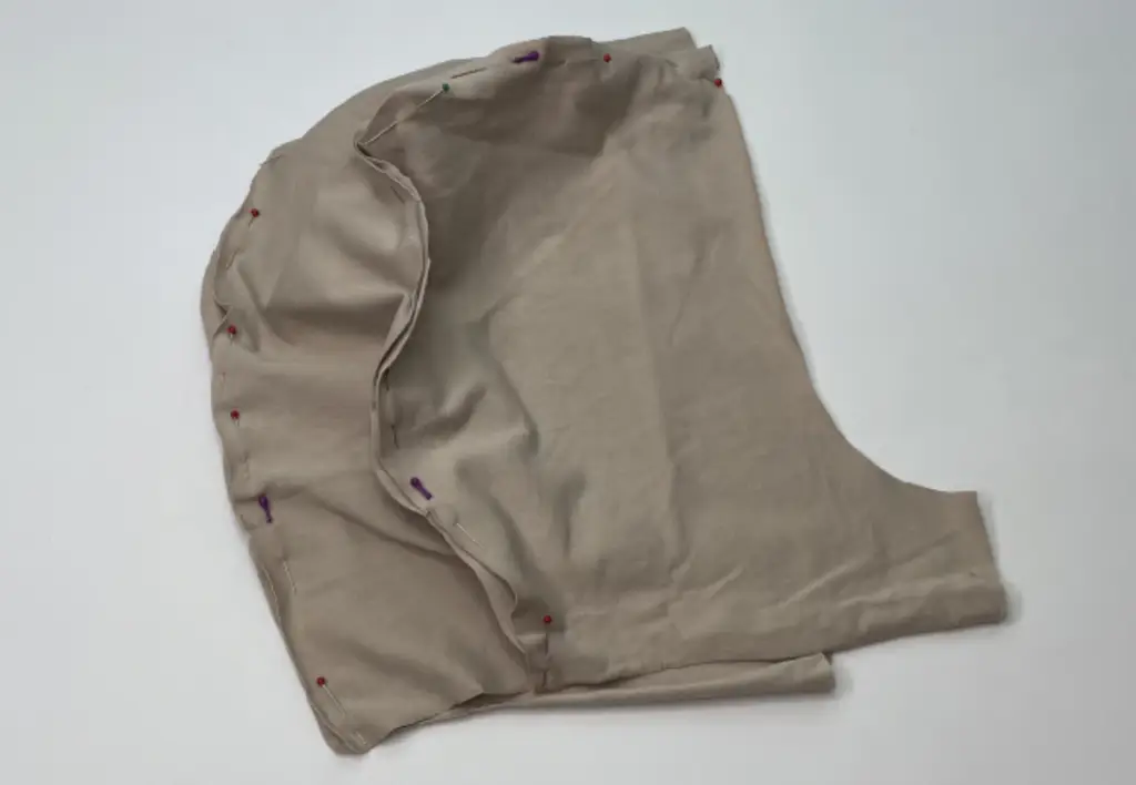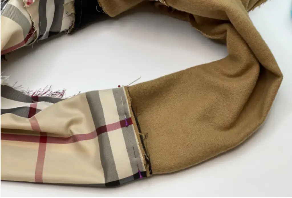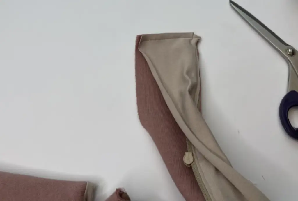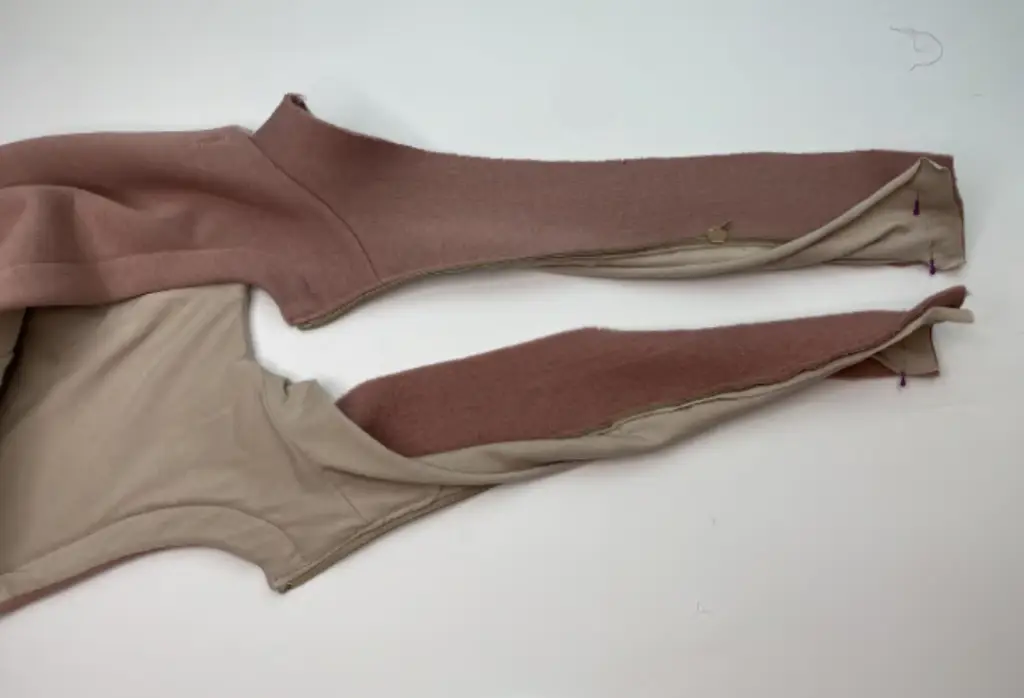 Pin the main fabric sleeve and lining sleeve along the bottom hem, right sides together. First, fold the bottom hem of the main fabric sleeve, then join the lining sleeve. Sew in place. Trim corners.