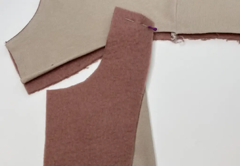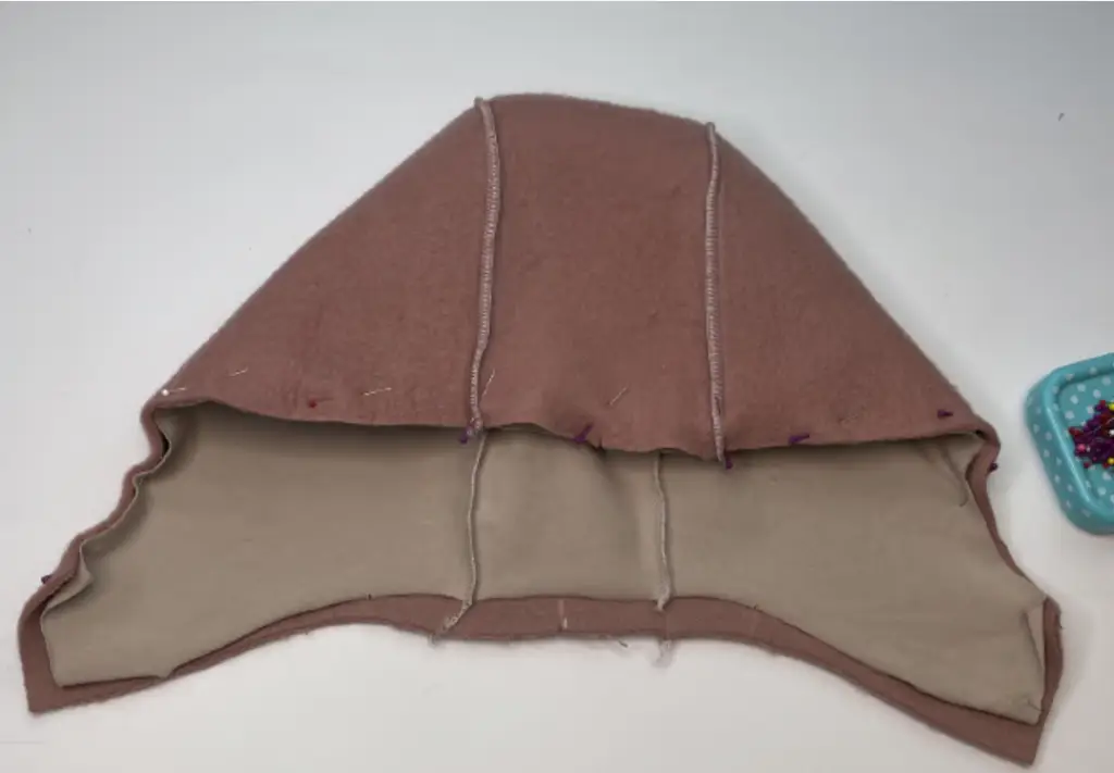 Pin the main fabric hood and the lining hood together with the right sides along the bottom hem from shoulder to shoulder. Stitch it.