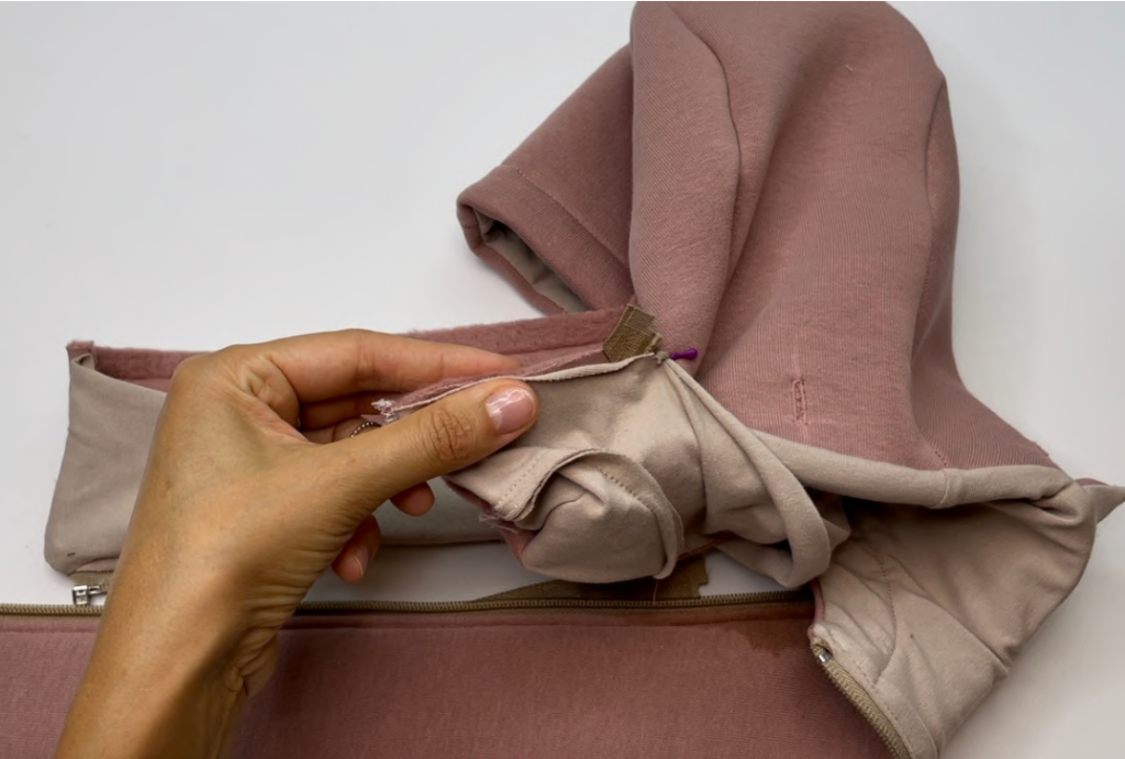 Pin the half of the zipper of the detachable hood to the Front facing detail. Pay attention to correct side matching. It is important that the half of the zipper on the left Front of the detachable hood matches to the half of the zipper on the left Front facing. The same matching on the right side.
