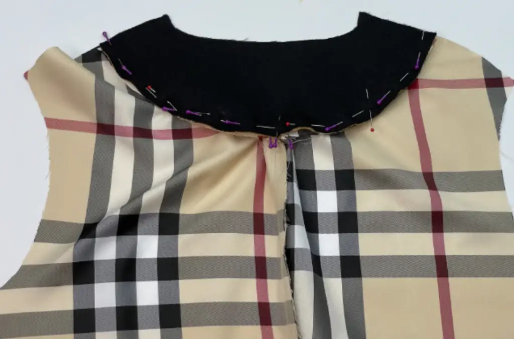 Insert the collar into the neckline. Align the upper collar with the lining, bottom collar with the garment’s neckline. Side of the collar is straight at the seam of the front facing.