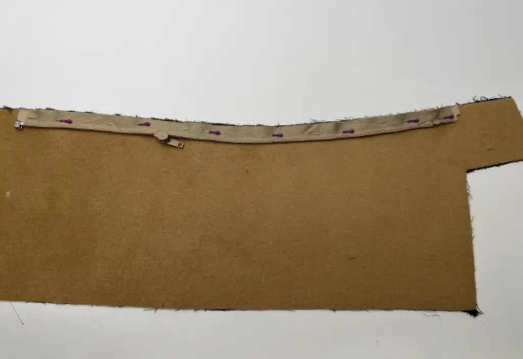 Pin the part of the zipper the the side edge of the main fabric bodice with the right sides together. Sew in place.