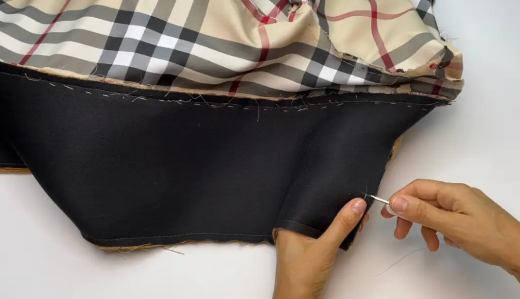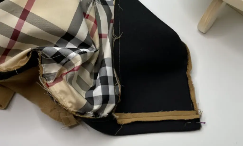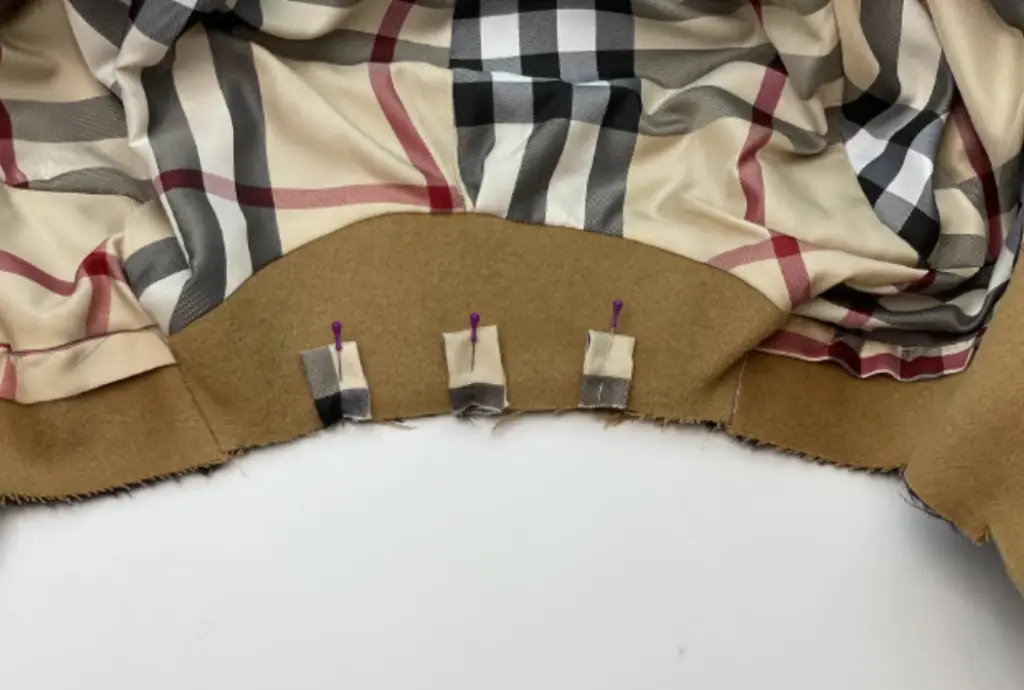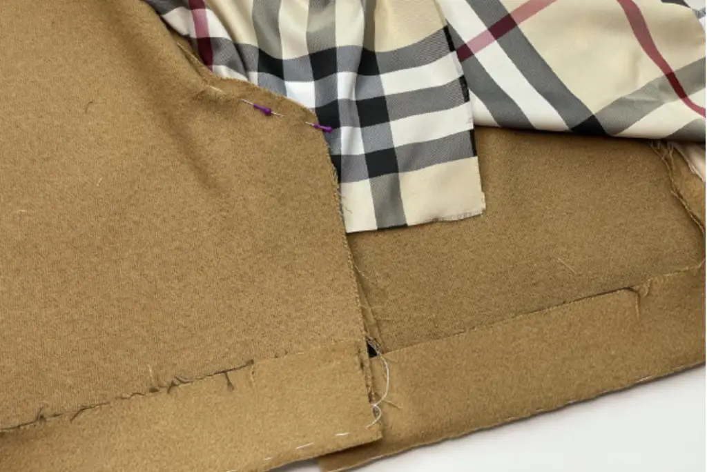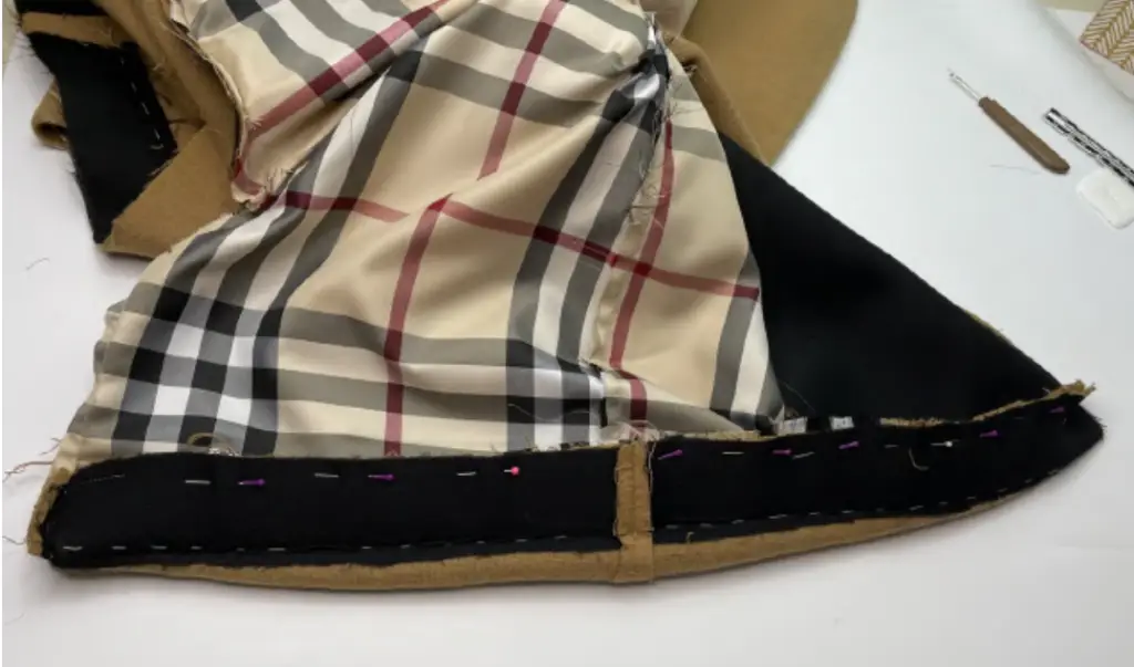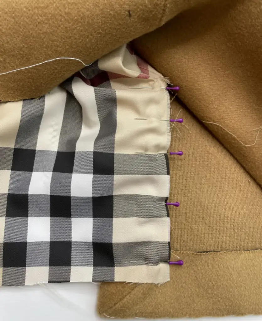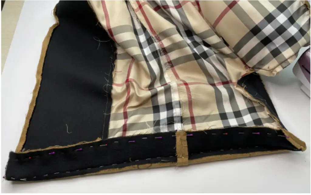 Pin the bottom hem of the inner vent and lining with the right sides together. Stitch 3-5 cm (1,18 – 1,97 in). Press seam allowances to the lining.