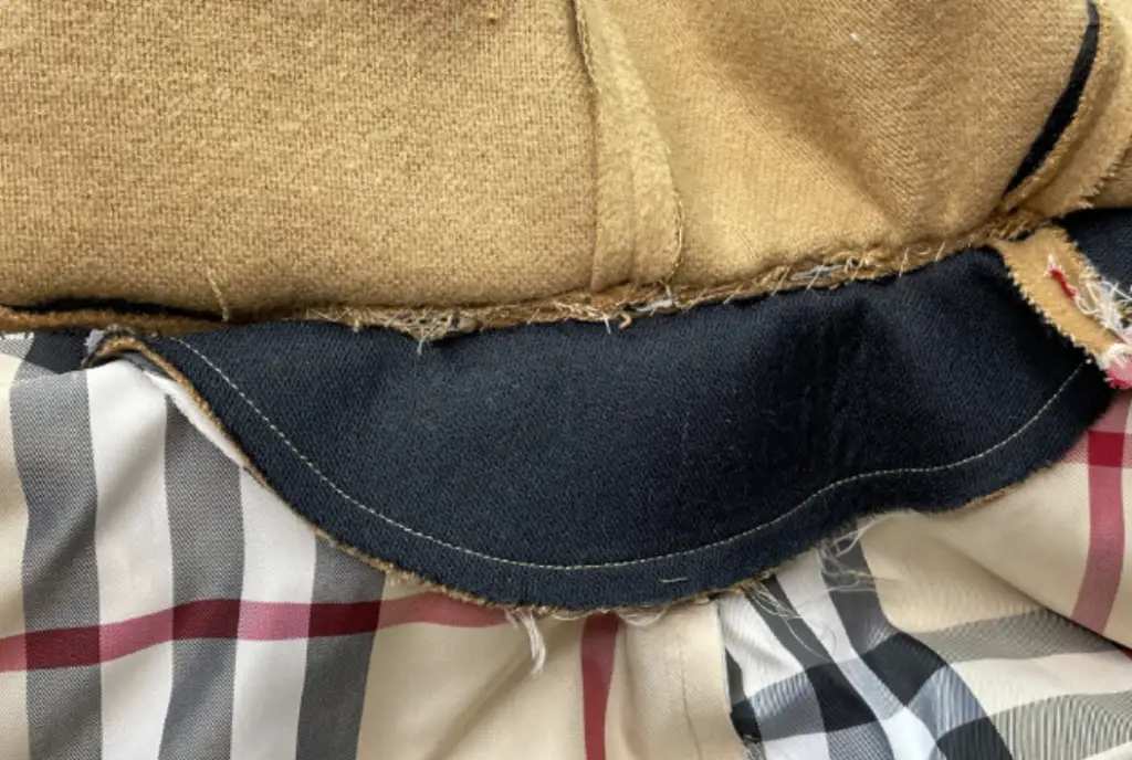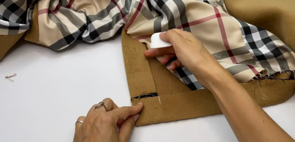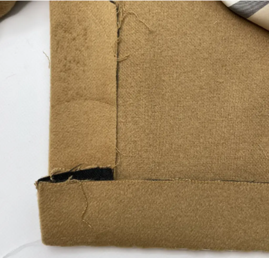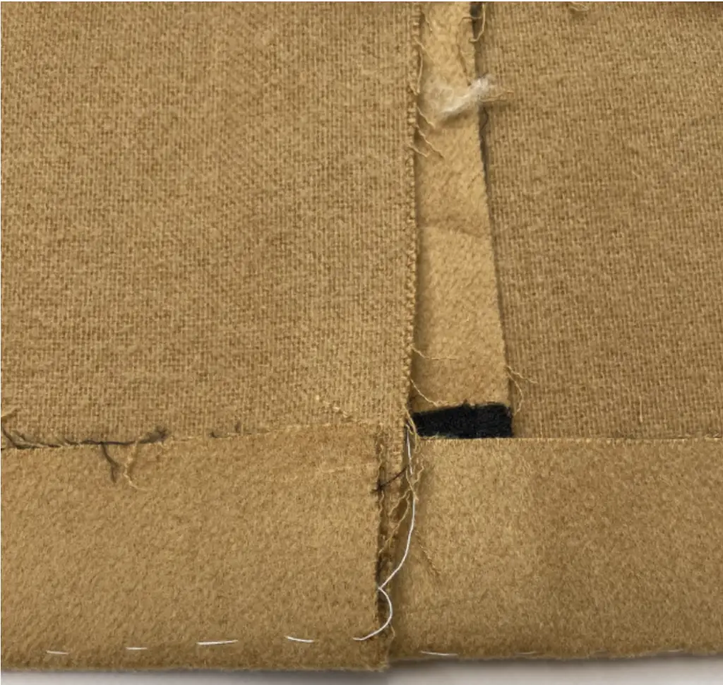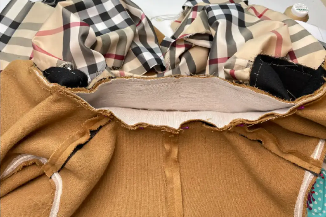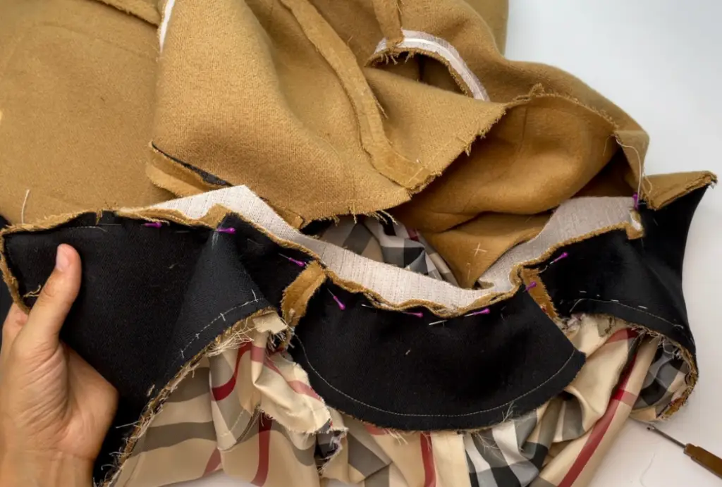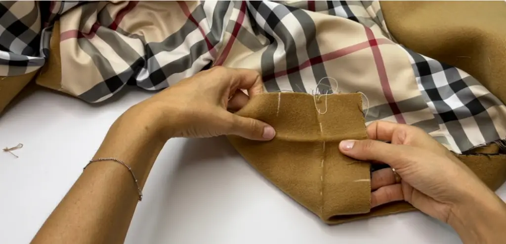 Pin the bottom hem of the inner vent and lining with the right sides together. Stitch 3-5 cm (1,18 – 1,97 in). Press seam allowances to the lining.