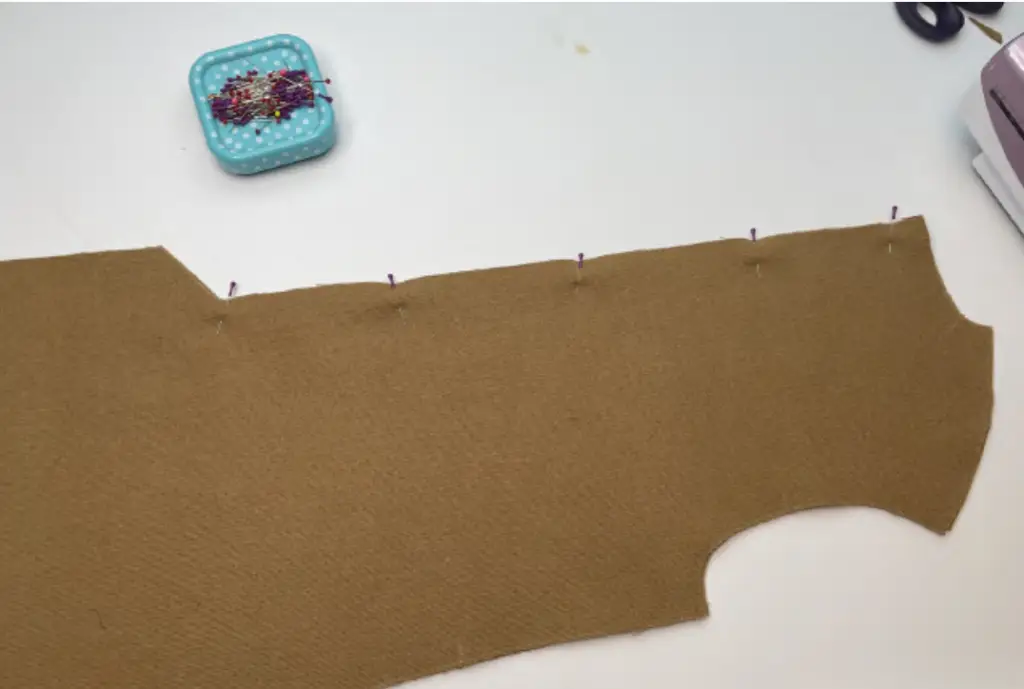 Fold the sleeve in half and pin its side edges. Pin the Front and Back along the side edges with the right sides together. Sew in place.