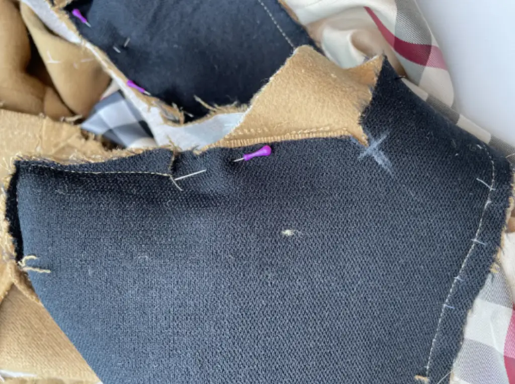 Pin the collar details along the side short edges, right sides together. Stitch it. Press seam allowances open. Clip the corners.