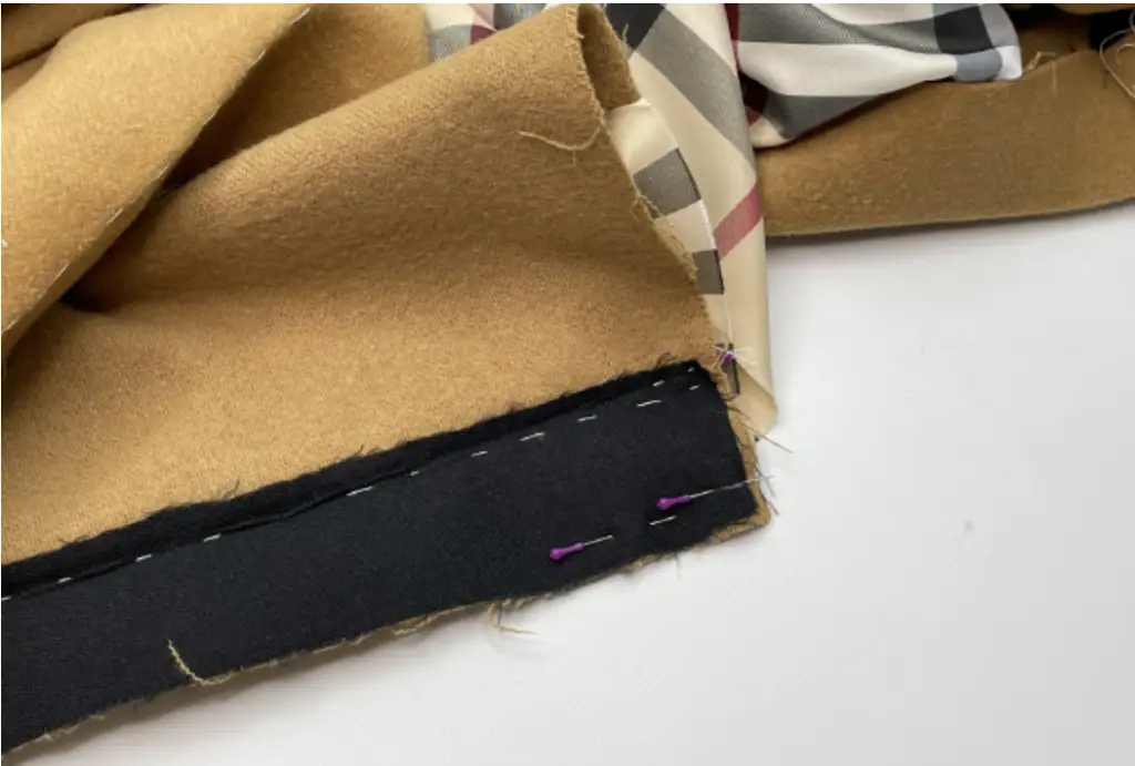 Pin the bottom hem of the lining and garment together, right sides together. Sew in place. Press seam allowances of the front facing open.