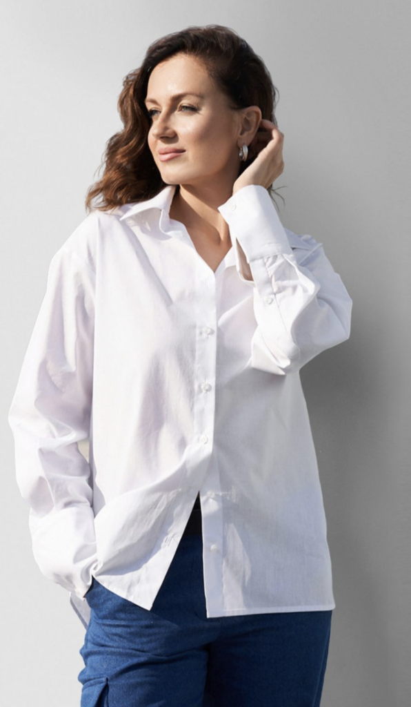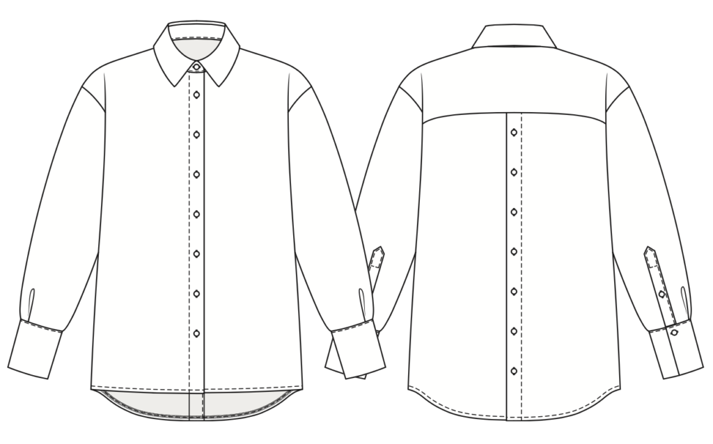 A mid-thigh length shirt with a turn-down shirt collar with a separate collar stand. It features a center front placket with buttonholes. Long sleeves are finished with buttoned cuffs. The back features back yoke and decorative placket.