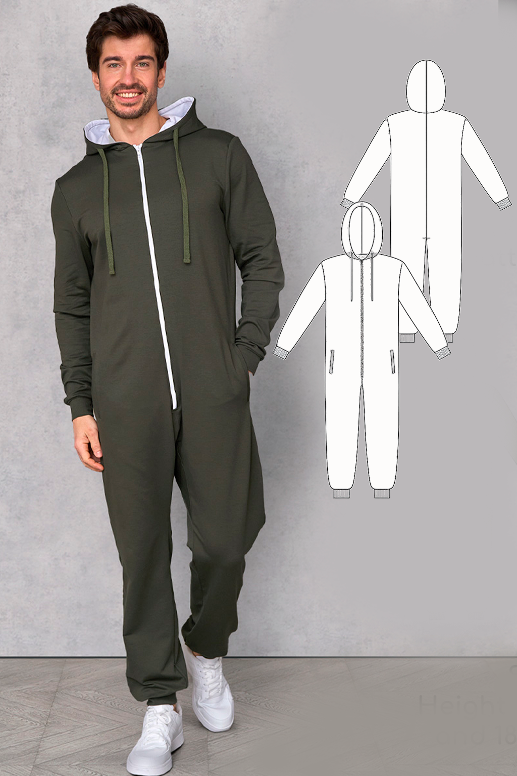 The cuffs on the sleeves and pant legs can be made from ribbed knit or ribbing. The inner finishing is for perfectionist style – the lining and facing of the neckline hide all the seams. Trust us, even if your man has never worn jumpsuits before, for his walks from now on he will be choosing this one!